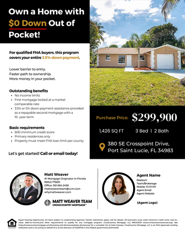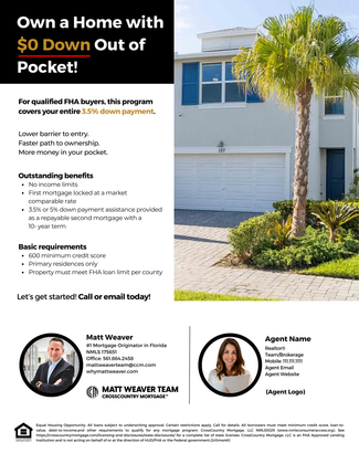 $0 down for qualified FHA Buyers, covering their entire 3.5% or 5% down payment! No income limits and first mortgage locked at a market comparable rate!